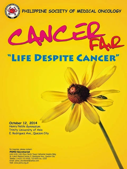 For those Cancer Patients, Cancer Survivors and their Family Members, the Philippine Society of Medical Oncology invites you to attend their Fifth Cancer Fair.